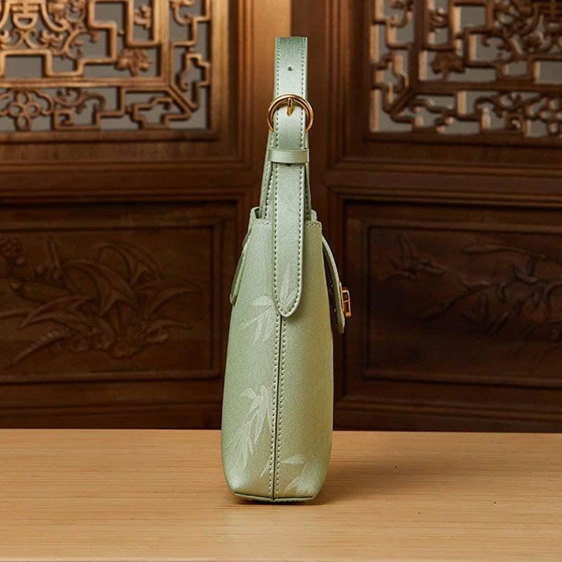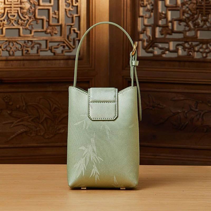 Embossed Leather Green Bamboo Leaf Phone Bag