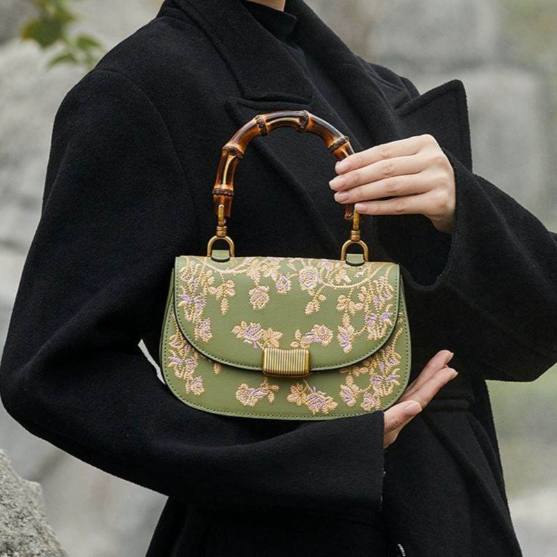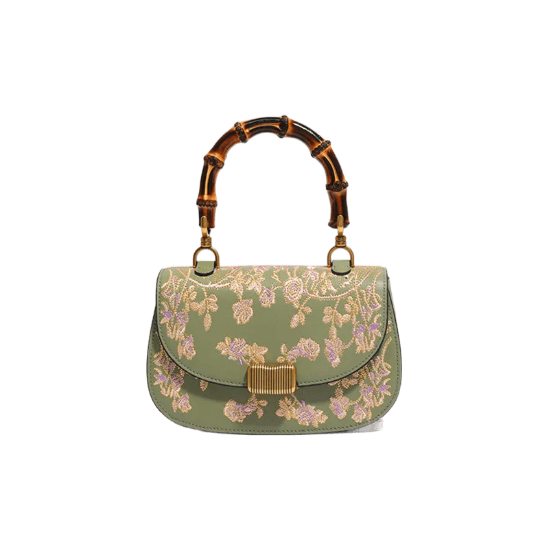 Handcrafted Embroidery Leather Green Handbag Camellia Bamboo Handle